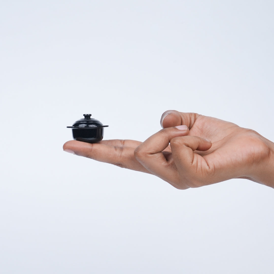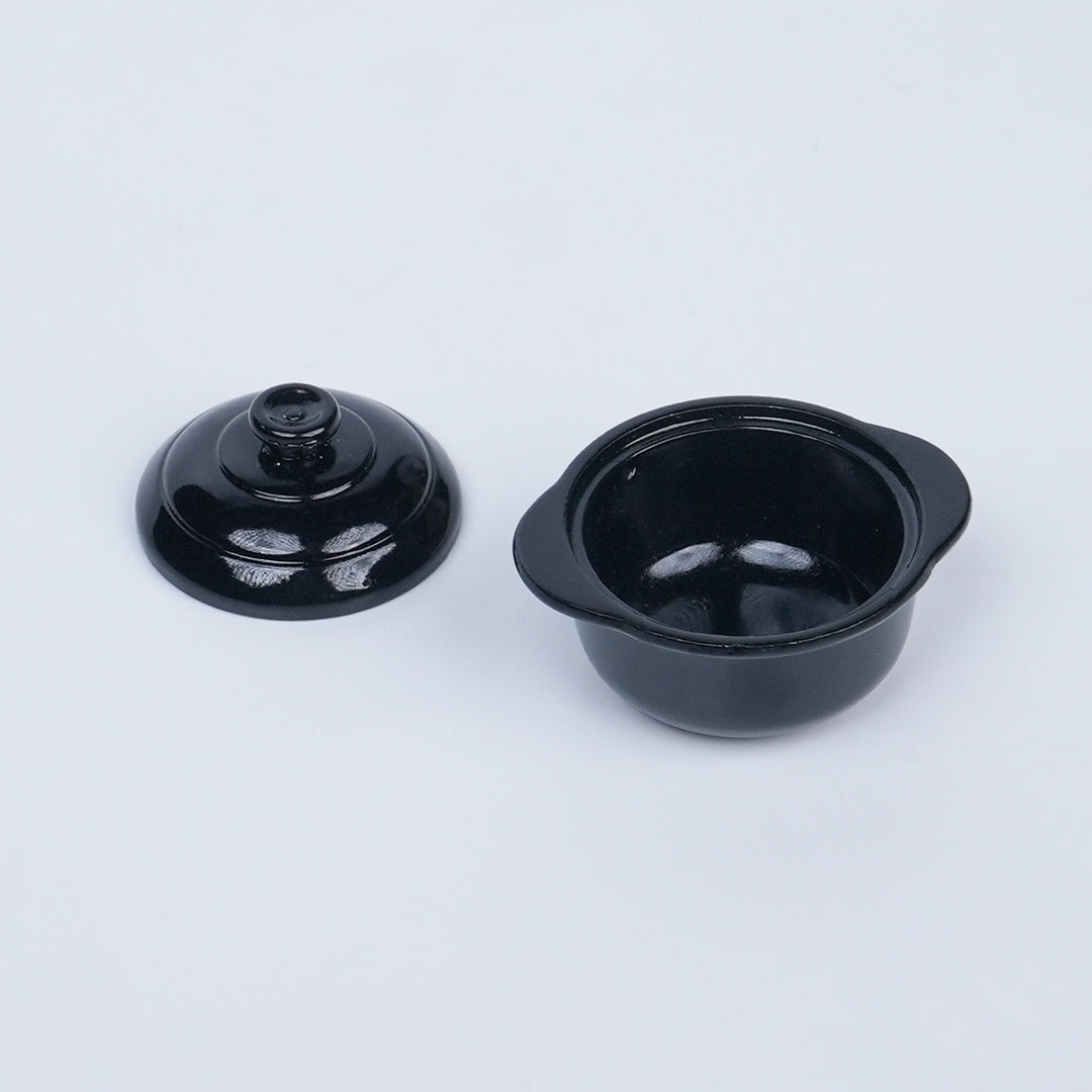 Elevate your doll house dining experience with our Black Metal Serving Bowl with lid. Made with a sleek black design, this miniature bowl includes a lid for keeping food fresh and warm. Perfect for entertaining tiny guests or adding a touch of elegance to your doll house meals.