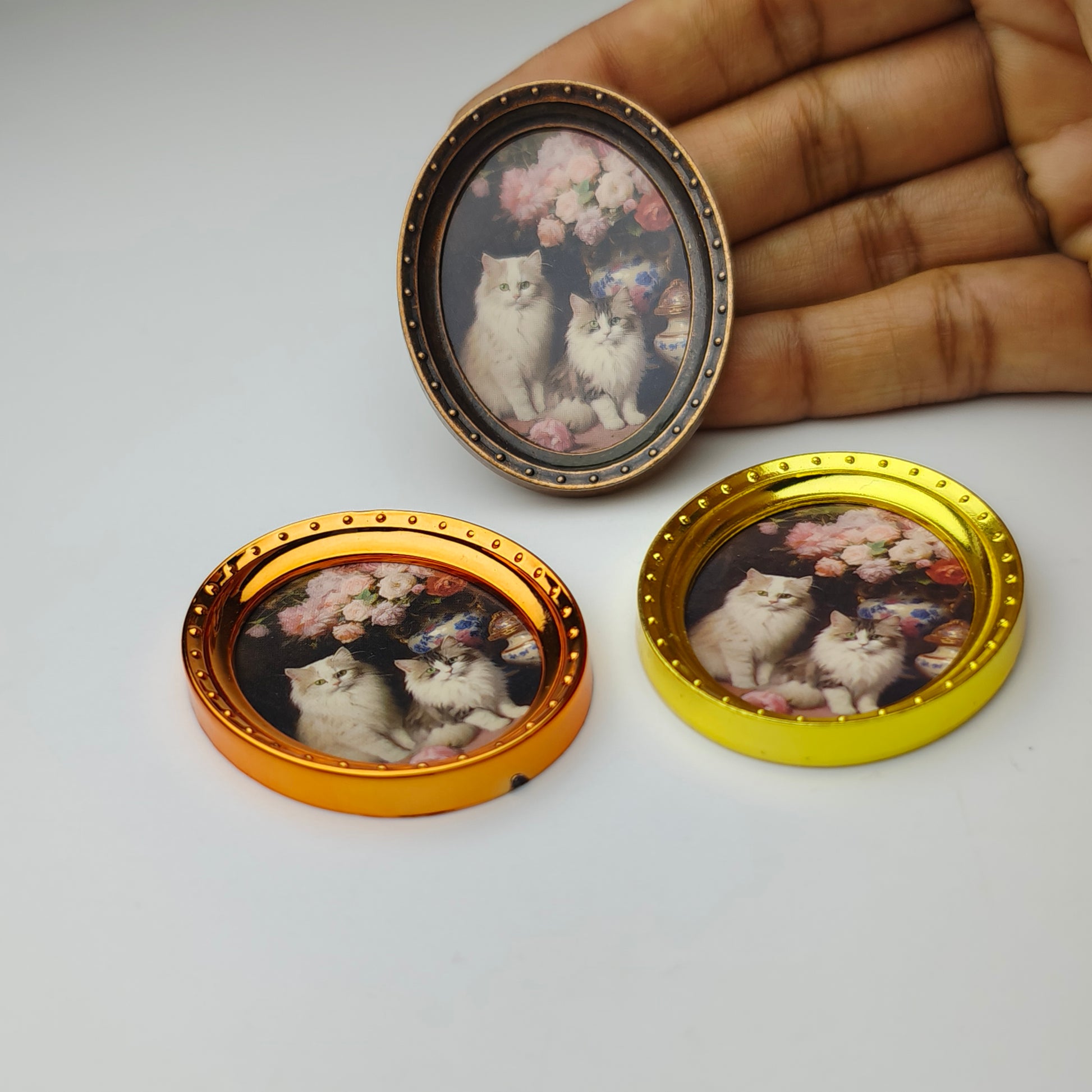 Miniature Frame per piece random.Expertly crafted, this dollhouse miniature cat frame will add a unique touch to any dollhouse. Made with precision and attention to detail, this frame features a lifelike cat design that will bring joy and charm to any room. The perfect addition to any miniature collection.