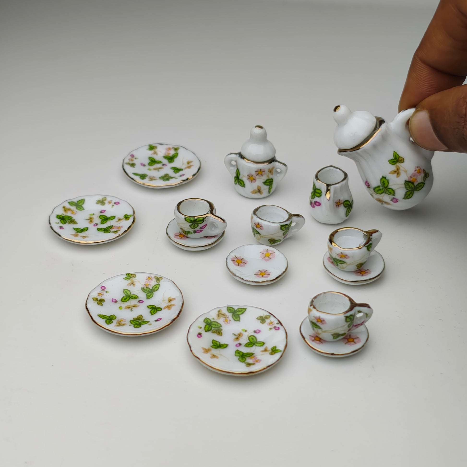 Expertly crafted and designed for dollhouse enthusiasts, our Miniature Green Floral Tea set offers intricate details and a touch of elegance. Made with high-quality materials, this set is the perfect addition to any miniature collection. Indulge in a cup of tea and enjoy the beauty of this miniature masterpiece.