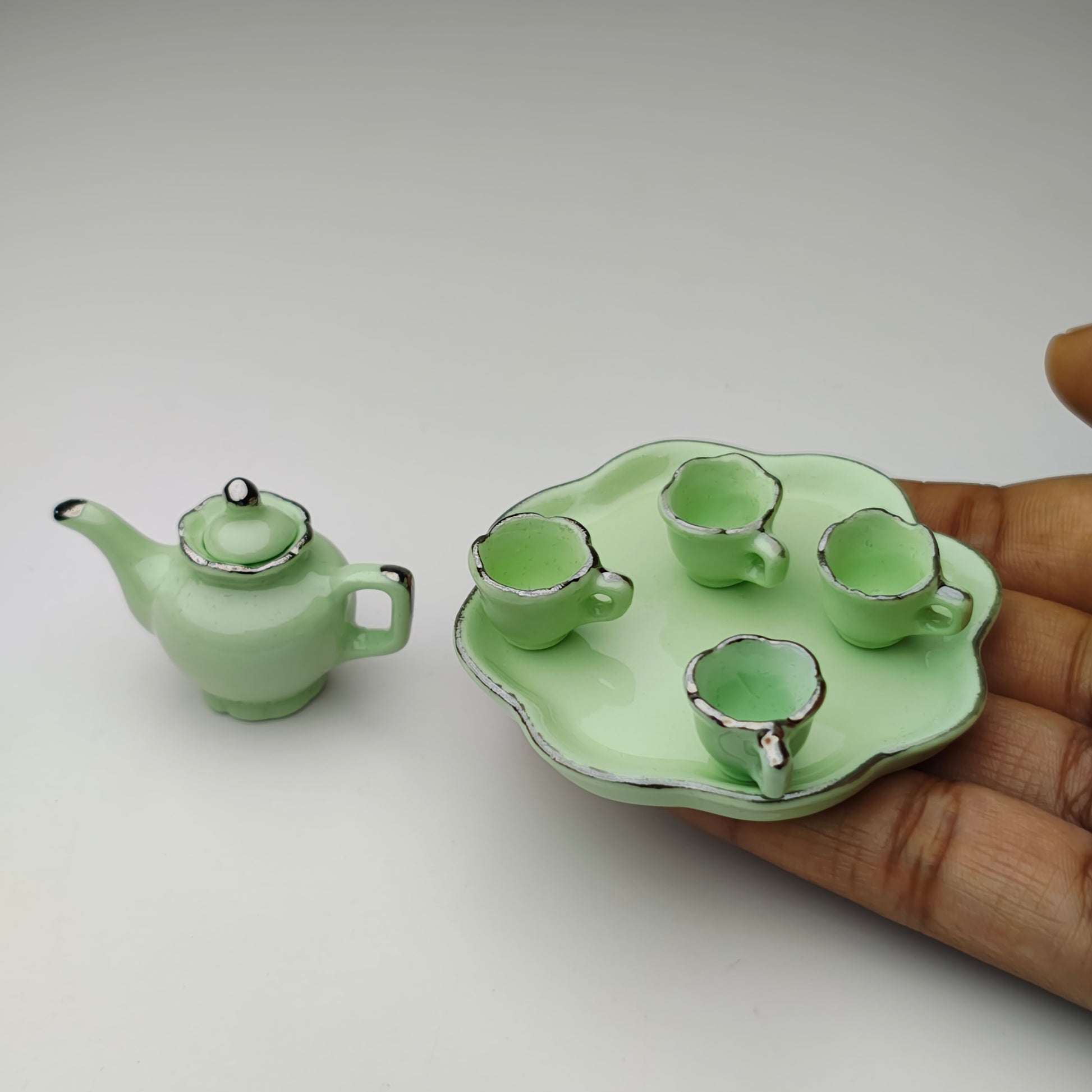 This Miniature Green Tea Set is a must-have for dollhouse collectors. With realistic design and intricate details, it adds an authentic touch to any miniature scene. Made with quality materials, it is a perfect addition for tea lovers and miniature enthusiasts.