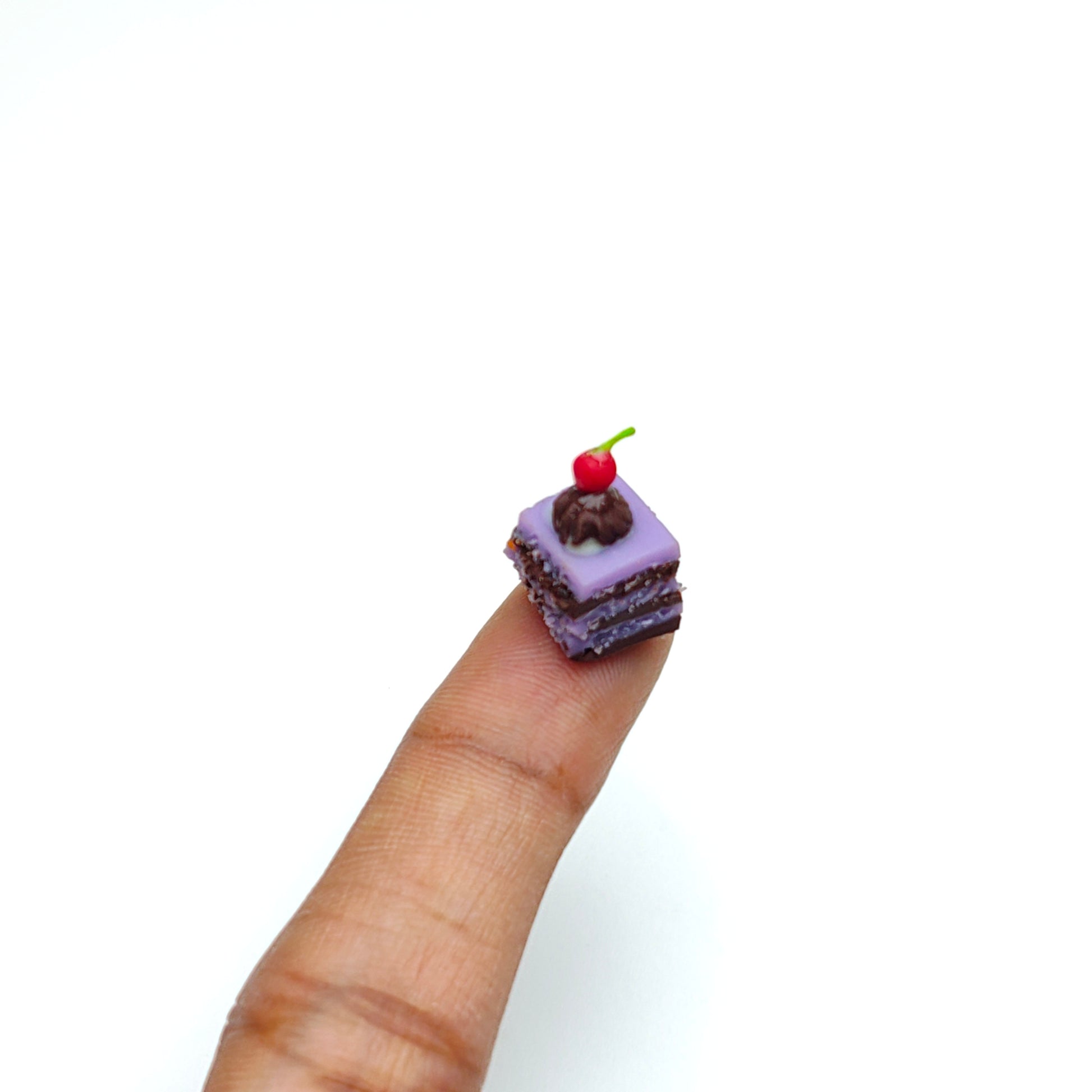 "Crafted with precision, this miniature lavender cherry cake is a doll house must-have. With realistic details and vibrant colors, it adds a touch of sweetness to any mini kitchen. Made with high-quality materials, this mini cake is a perfect addition to your doll house collection."
