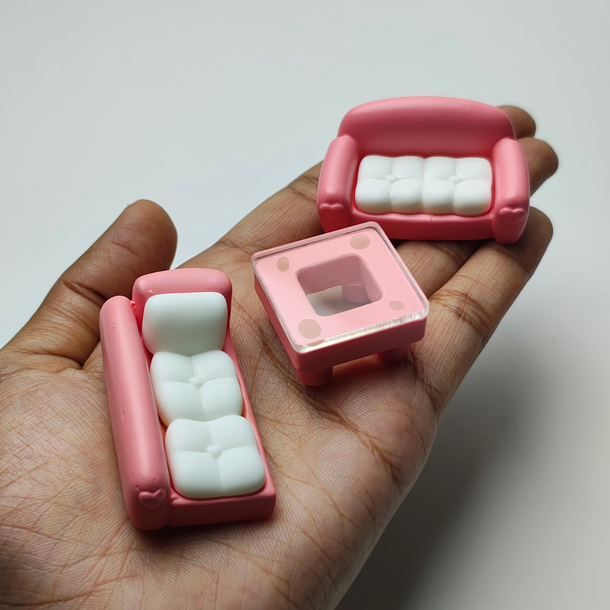 This sofa set includes a miniature decor feature, adding a touch of elegance and charm to any living space. Crafted with precision and attention to detail, this sofa set is perfect for those looking to elevate their home decor. Enhance your space with this beautifully designed and functional piece.