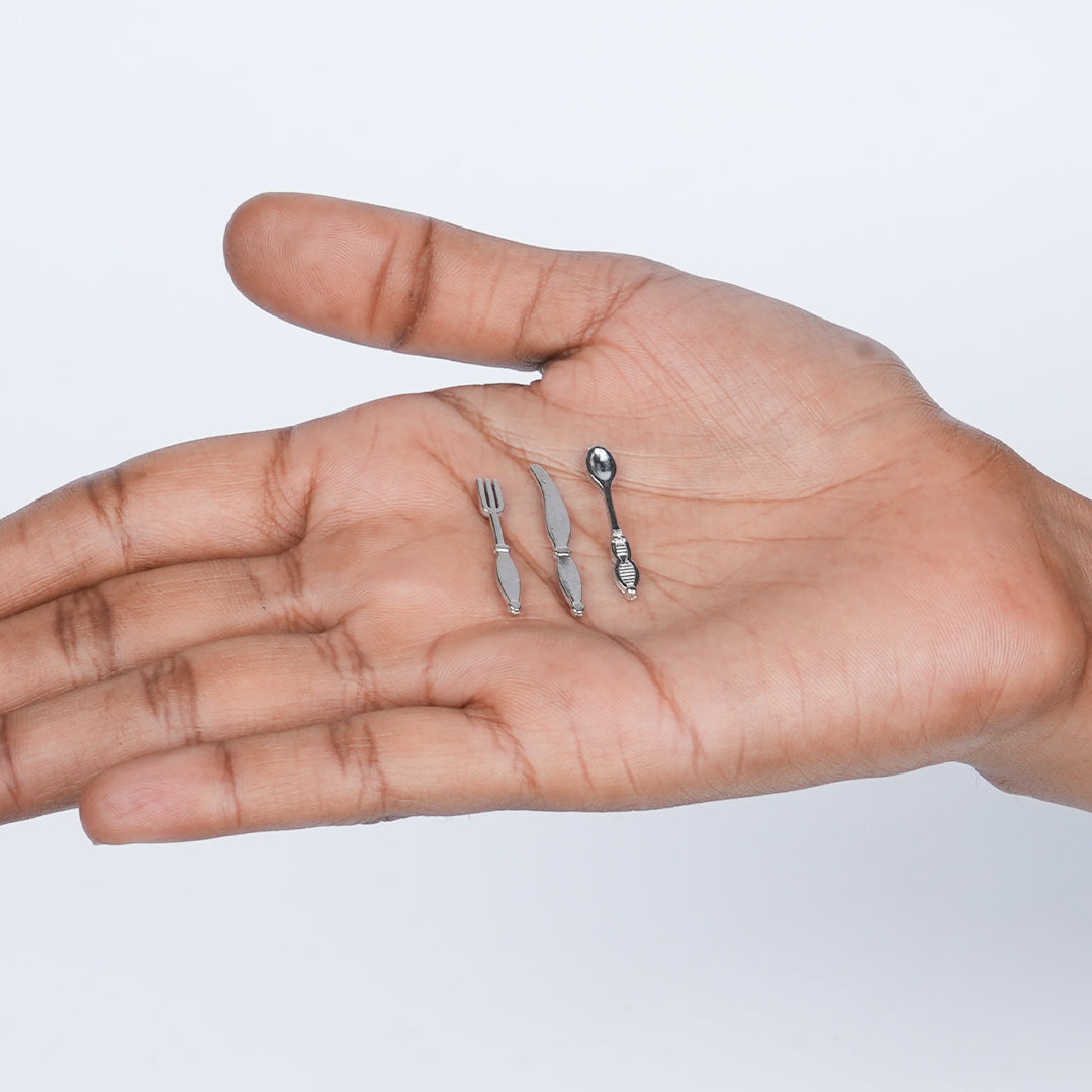 Bring timeless charm to your dollhouse dining table with this Tiny Silver Elegance Set. Intricately crafted with a vintage finish, this miniature fork, knife, and spoon trio adds a touch of luxury and realism to any miniature scene. Perfect for dollhouses, dioramas, or collectors who love detailed mini accessories.