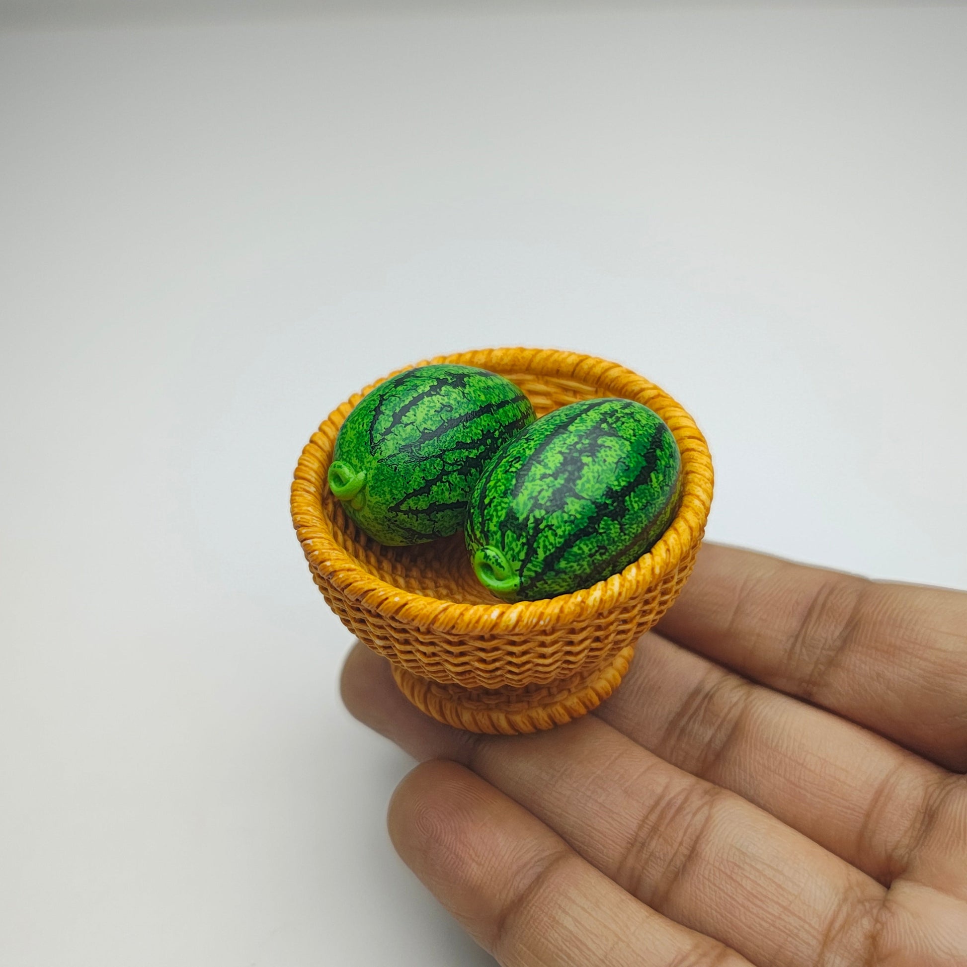 Dimension 3 cm x 3cm.This Tiger Stripe Watermelon Basket is a dollhouse miniature, perfect for adding a touch of realism to any dollhouse or miniature scene. Each basket features a unique tiger stripe pattern and is hand-woven with care. Enhance your collection with this adorable and realistic miniature replica.