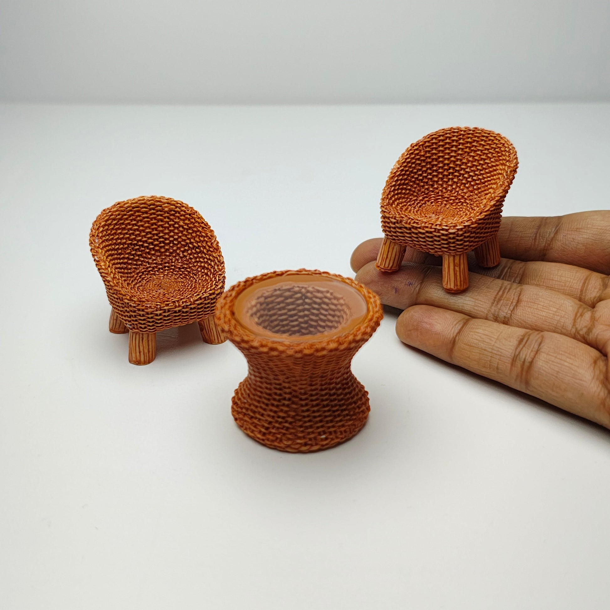 Enhance your dollhouse with this high-quality Wicker Coffee Table Set. Made with intricate detailing and a miniature size, it adds a touch of elegance to any room. Crafted from durable materials, this chair set is built to last. Perfect for collectors and dollhouse enthusiasts.